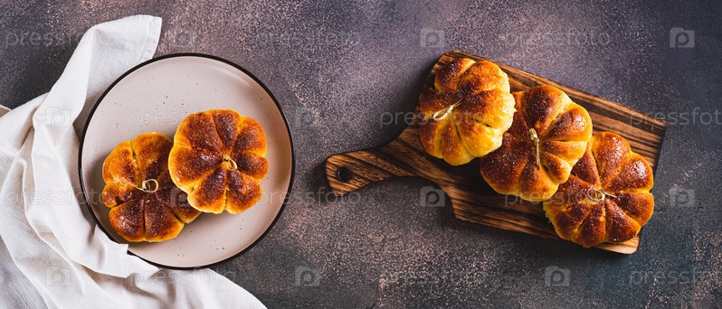 Осенние булочки в форме тыквы, посыпанные сахаром, на столешнице, веб-баннер
