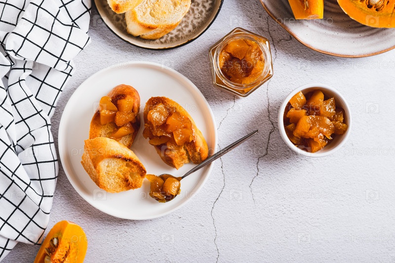 Натуральный тыквенный джем на тосте на тарелке на столешнице