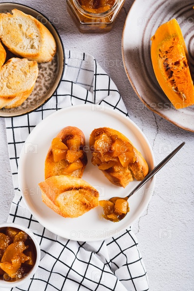 Аппетитная брускетта с тыквенным джемом на тарелке на столешнице и вертикальный вид