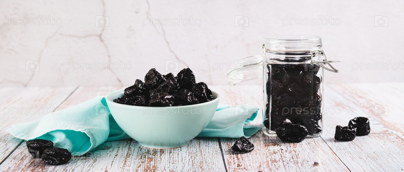 Сладкие сушеные черносливы в миске и банке на столе веб-баннер