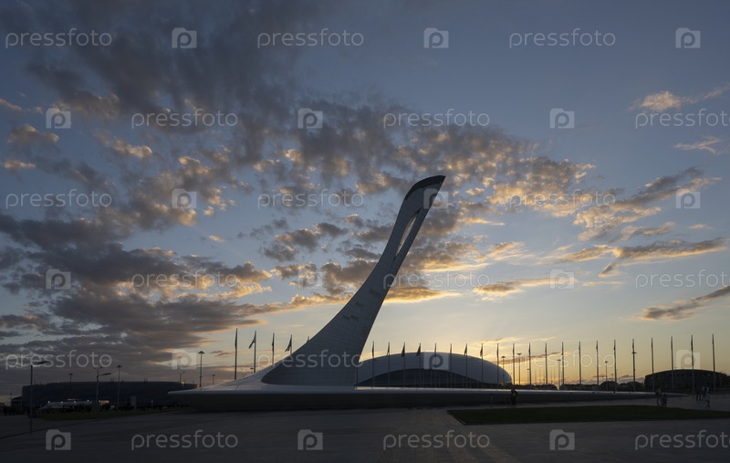 Сочи, Россия. 8 октября 2024 года. Живописная панорама на закате осеннего дня на главной олимпийской площади с чашей олимпийского огня в виде белого лебедя