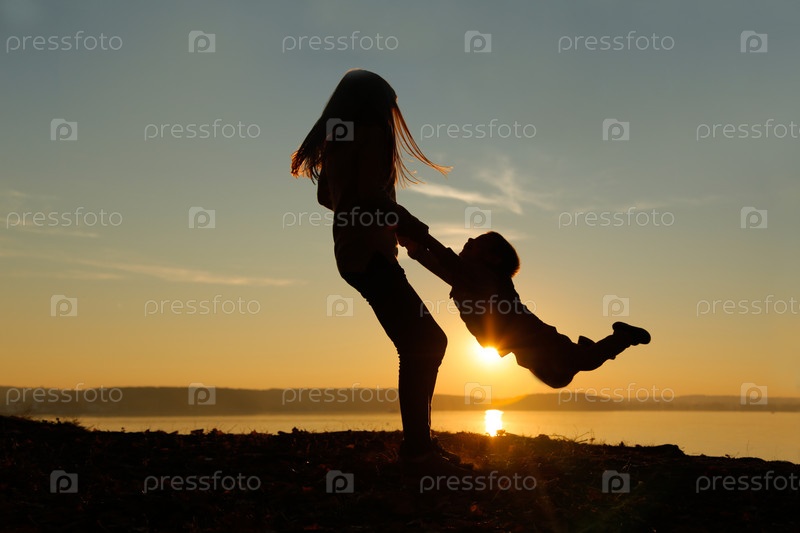 Силуэт идеально передает образ девочки, держащей брата на руках на фоне заката у воды