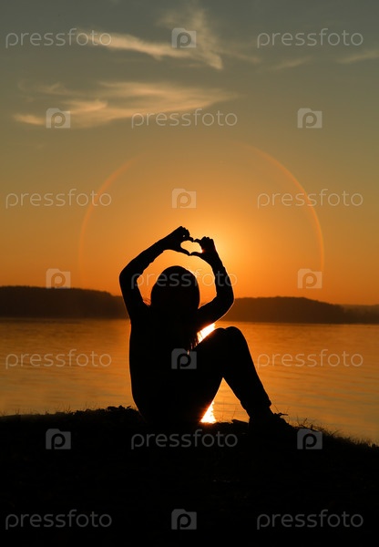 Силуэт девушки, сложившей пальцы в форме сердца, на фоне яркого заката над мерцающей водой