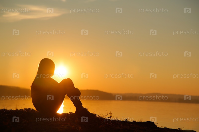 Силуэт длинноволосой девушки, сидящей на закате у моря