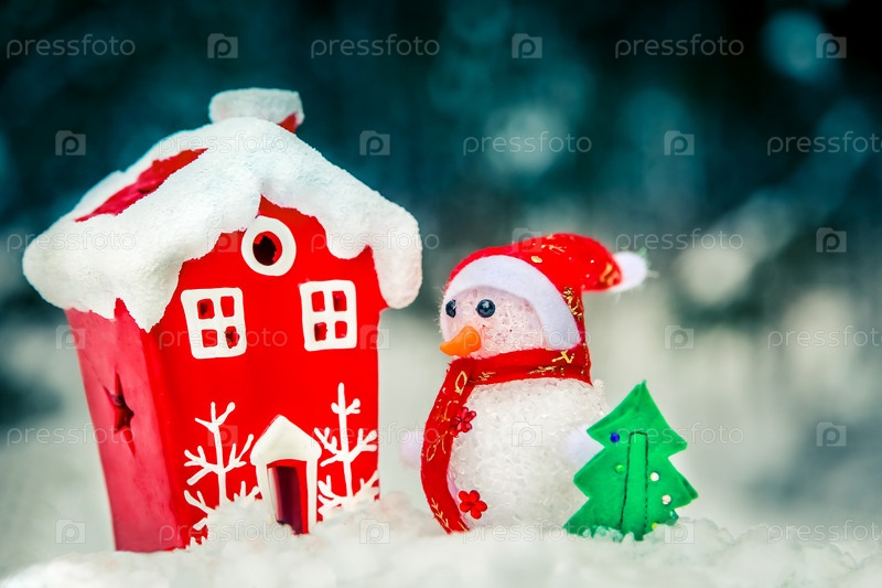 Очаровательная зимняя сцена со снеговиком и уютным домиком