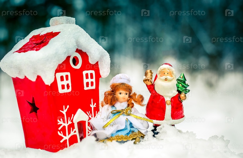 Праздничная сцена с Санта-Клаусом, очаровательной декоративной снегурочкой и уютным, гостеприимным красным домиком для праздников