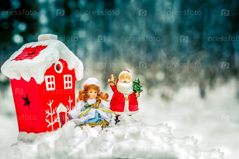 Праздничная рождественская сцена с Сантой и куклой в снегу