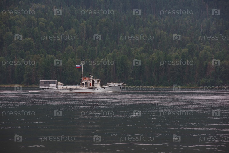 Корабль с российским флагом на Телецком озере в горах Алтая