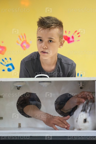 Игра в слепую догадку на ощупь. Мальчик догадывается на ощупь, что он не видит в коробке, кролик в коробке. С днем рождения, празднование или игры с друзьями концепция