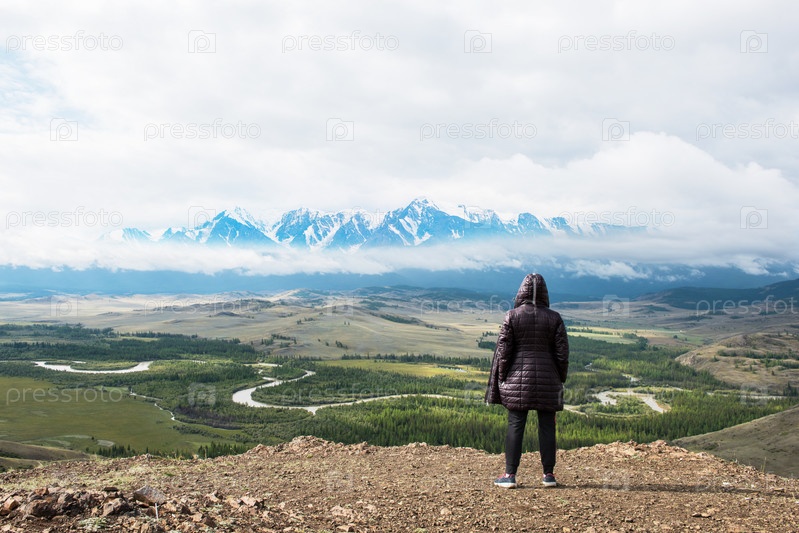 Женщина смотрит на ледник в горах Алтая. Отдых в горах или концепция глобального потепления