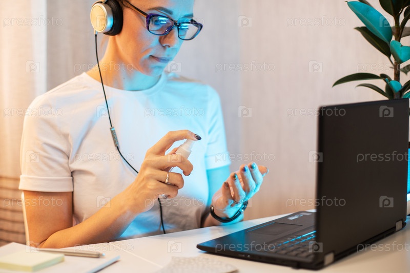 Женщина дезинфицирует поверхность телефона