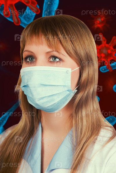 Женщина-врач в медицинской маске на трехмерном генерируемом фоне COVID-19