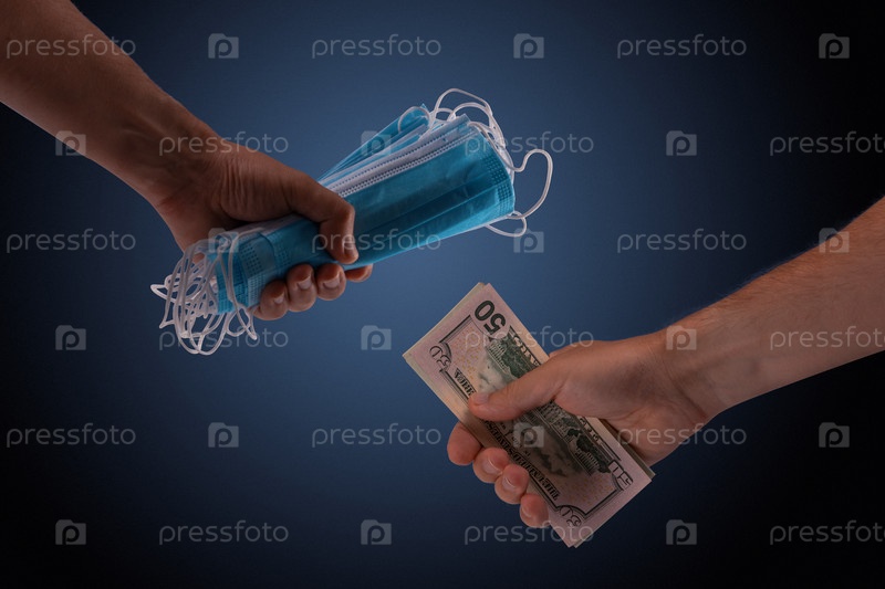 Продать - купить концепцию медицинской маски для лица. Руки держат защитные маски для лица и много долларов США банкноты в