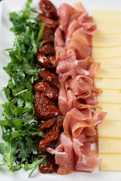 Тарелка с сыром прошутто и вялеными томатами