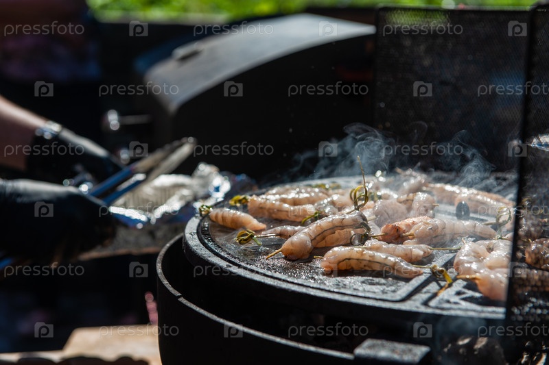 Профессиональный повар готовит креветки на гриле на открытом воздухе, концепция питания или кейтеринга