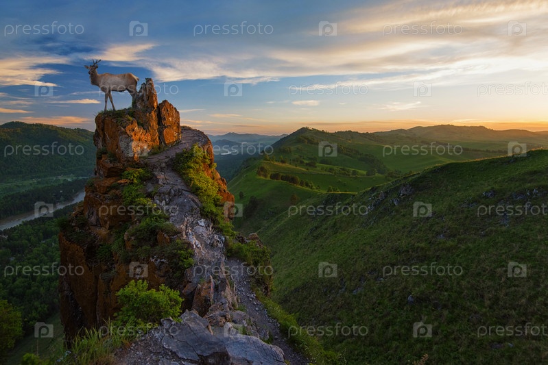 Марал на рассвете красоты на вершине