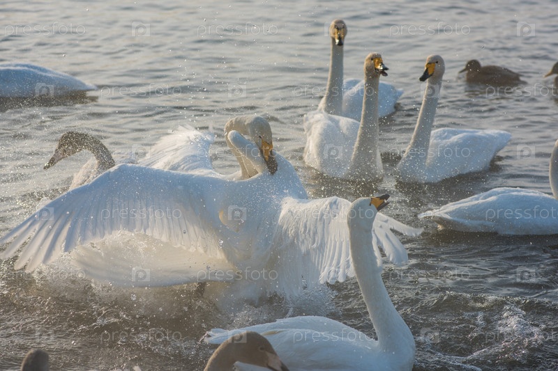 Борьба белых лебедей-кликунов в незамерзающем зимнем озере. Место зимовки лебедей, Алтай, Сибирь, Россия