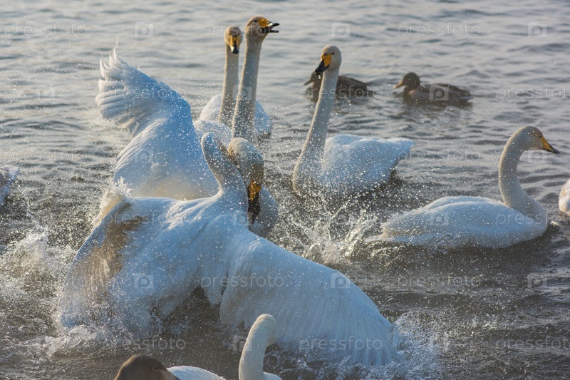 Борьба белых лебедей-кликунов в незамерзающем зимнем озере. Место зимовки лебедей, Алтай, Сибирь, Россия