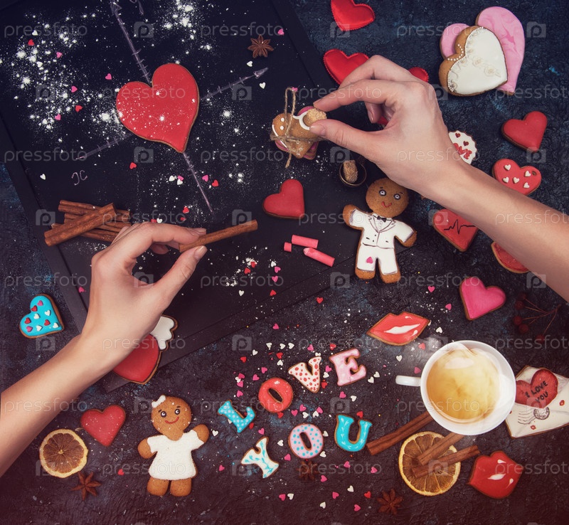 Женские руки украшают композицию из имбирных пряников «Любовь»
