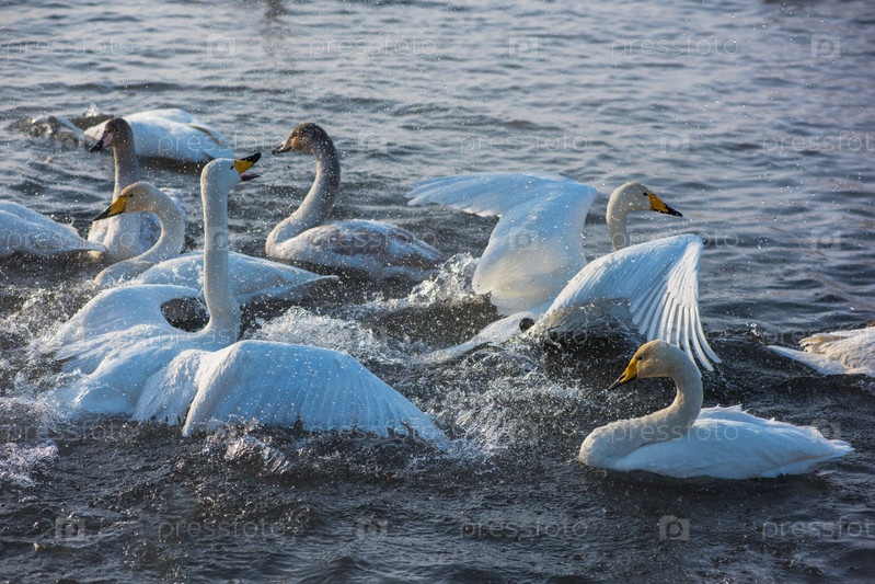 Борьба белых лебедей-кликунов в незамерзающем зимнем озере. Место зимовки лебедей, Алтай, Сибирь, Россия