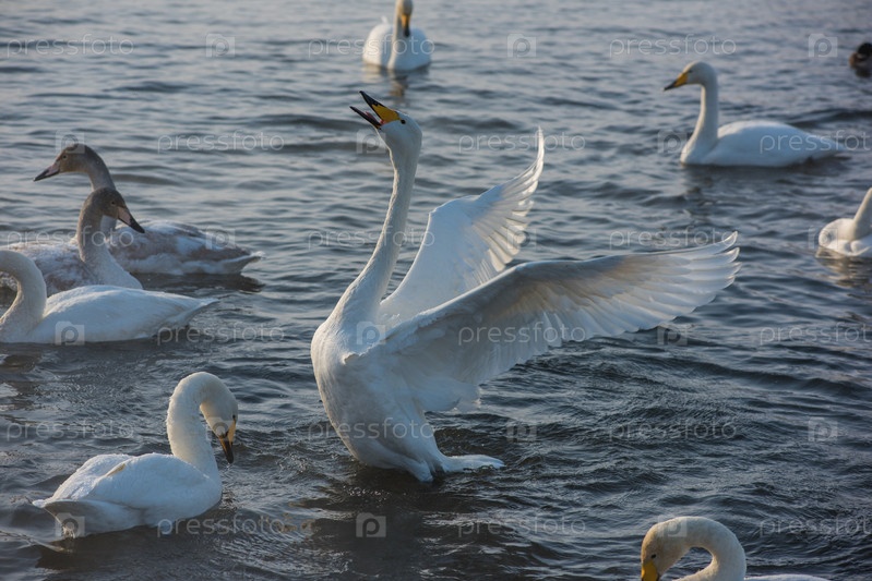 Красивые белые лебеди-кликуны плавают в незамерзающем зимнем озере. Место зимовки лебедей, Алтай, Сибирь, Россия