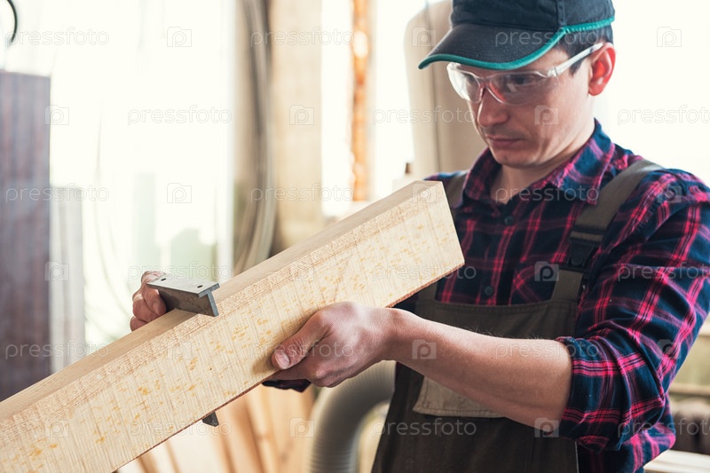 Рабочий измеряет деревянную доску угловой линейкой