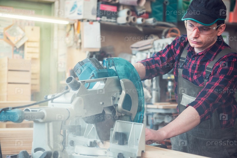 Строитель режет деревянную доску циркулярной пилой