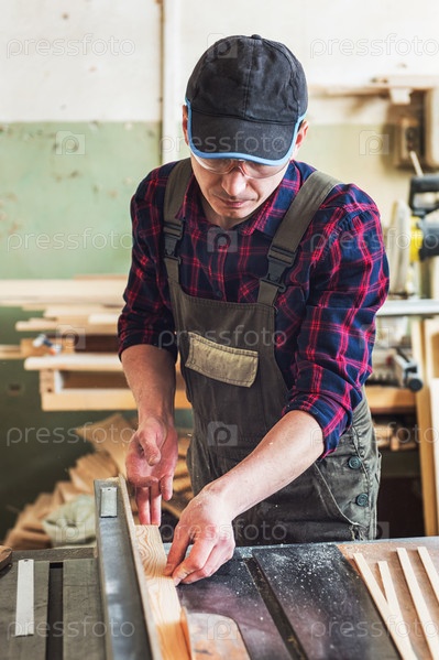 Плотник режет деревянную доску циркулярной пилой. Профессия, плотницкое дело и столярная концепция