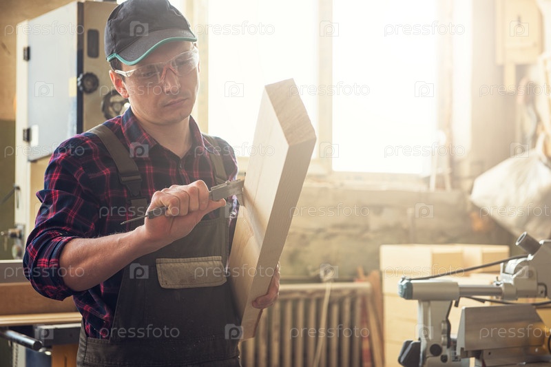 Рабочий делает измерения деревянной доски угловой линейкой. Профессия, плотницкое дело и столярное дело концепция