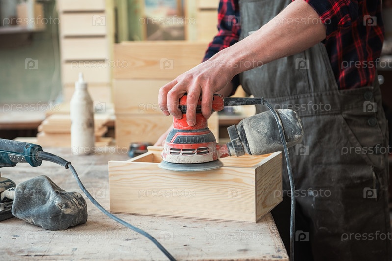 Рабочий шлифует деревянную коробку углового шлифовального станка