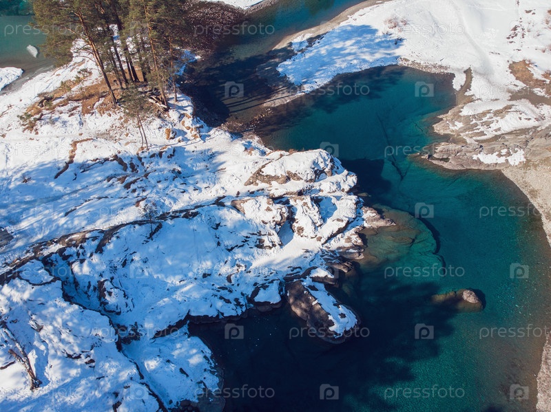 Вид с воздуха на зимние голубые озера в горах Алтая