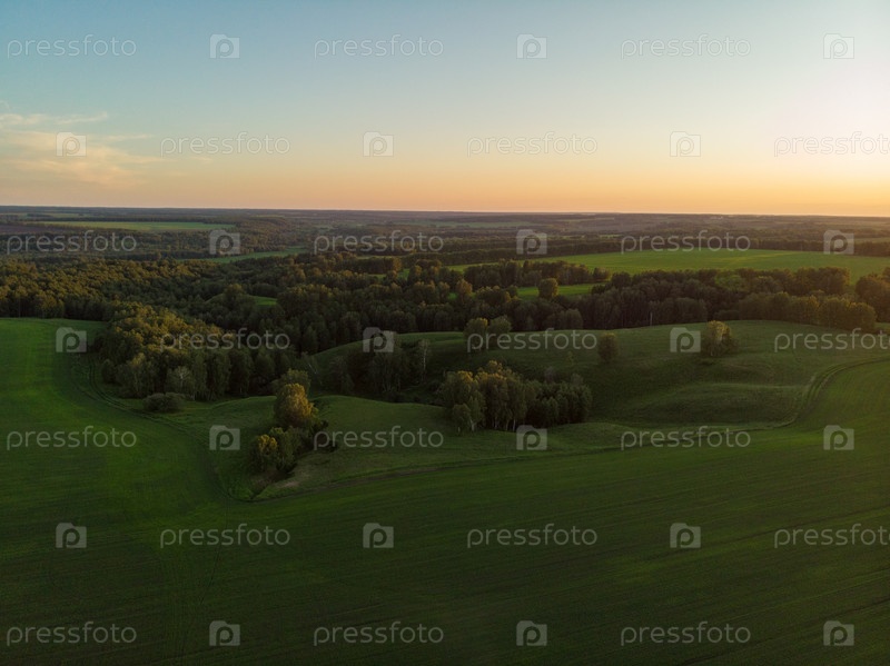 Вид сверху на зеленые поля и луга в вечернее лето. Пейзаж с дроном на Алтае