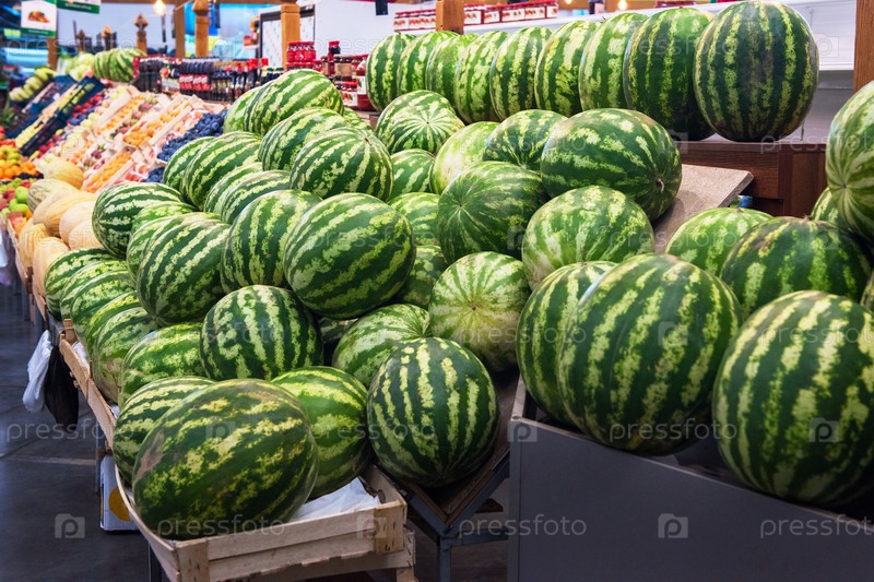 Спелые арбузы на фермерском рынке: свежие органические полезные арбузы в продуктовом магазине