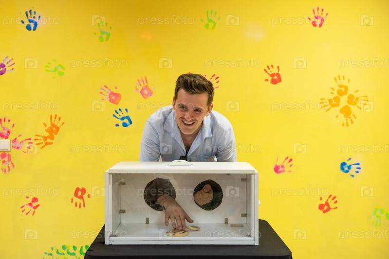 Игра в слепую догадку на ощупь. Человек догадывается на ощупь, что он не видит в коробке, Змея в коробке. С днем рождения празднование или игры с друзьями концепция