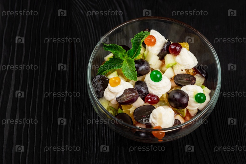 Салат из винограда яблок груш киви апельсинов с сыром маскарпоне и сливками. Здоровый свежий фруктовый летний салат в стеклянной миске на черном деревянном фоне с копией пространства