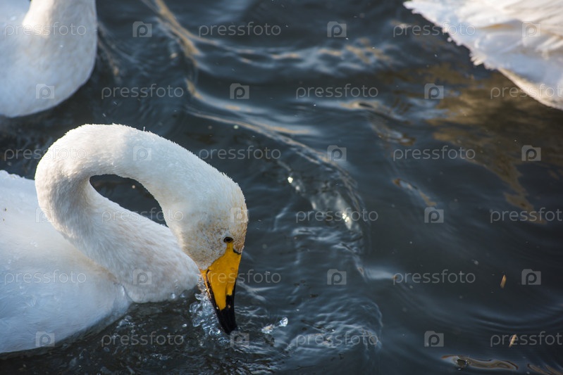 Красивые белые лебеди-кликуны плавают в незамерзающем зимнем озере. Место зимовки лебедей, Алтай, Сибирь, Россия