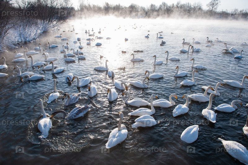 Красивые белые лебеди-кликуны плавают в незамерзающем зимнем озере. Место зимовки лебедей, Алтай, Сибирь, Россия