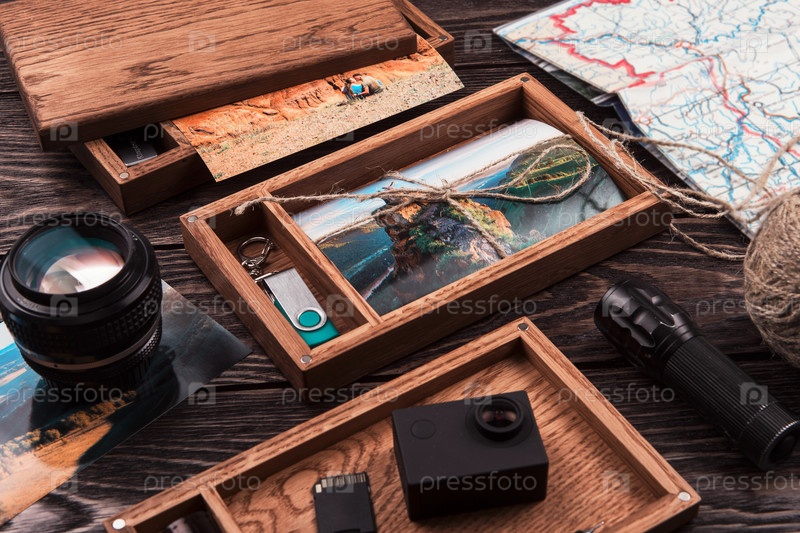 Деревянная фотокоробка с фото из путешествия. Украшена разными вещами. Концепция путешествия