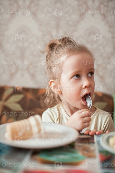 Маленькая смешная девочка ест мороженое