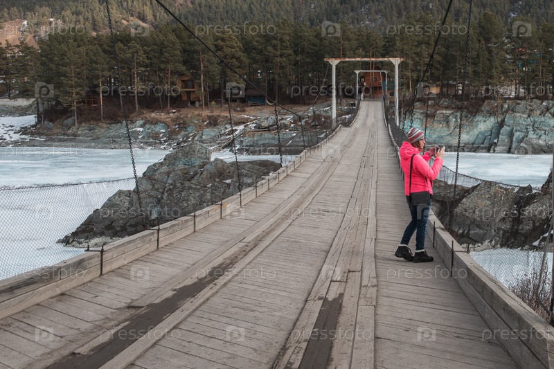 Счастливая женщина фотографирует на мосту у реки в прекрасный солнечный весенний день, в горах Алтая. Концепция путешествия и отпуска
