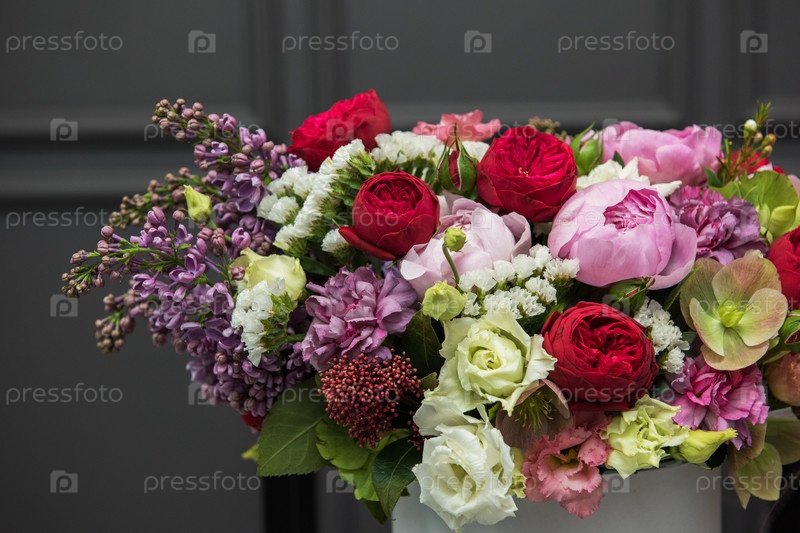 Букет из разных красивых цветов в круглой подарочной коробке на темном фоне