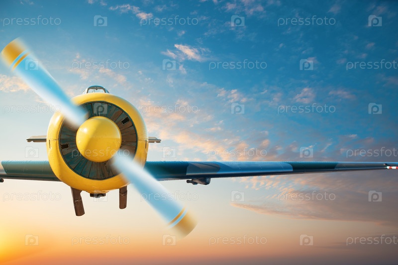 Маленький самолет летит в синем закатном небе