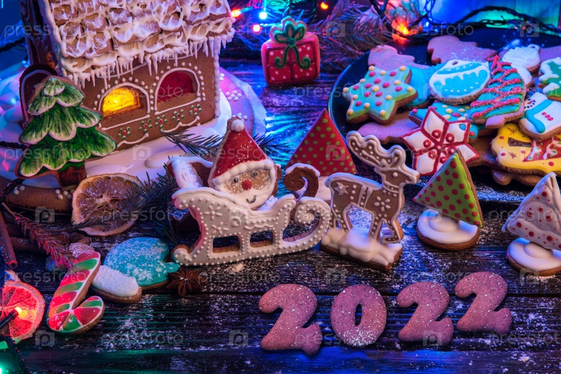 Имбирное печенье на новый 2022 год на деревянном фоне, рождественская тема