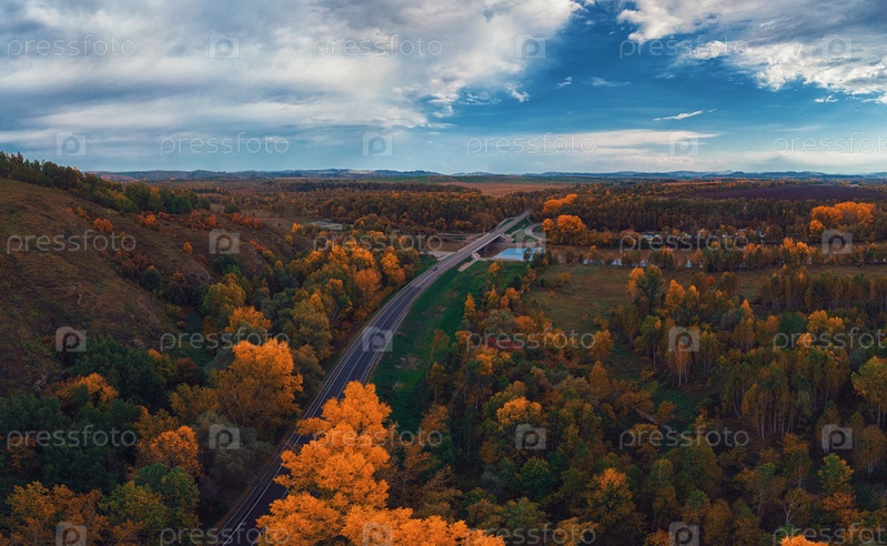 Вид с воздуха на дорогу в красивом осеннем лесу Алтая. Красивый пейзаж с пустой сельской дорогой, золотая осень на Алтае: деревья с красными, желтыми и оранжевыми листьями