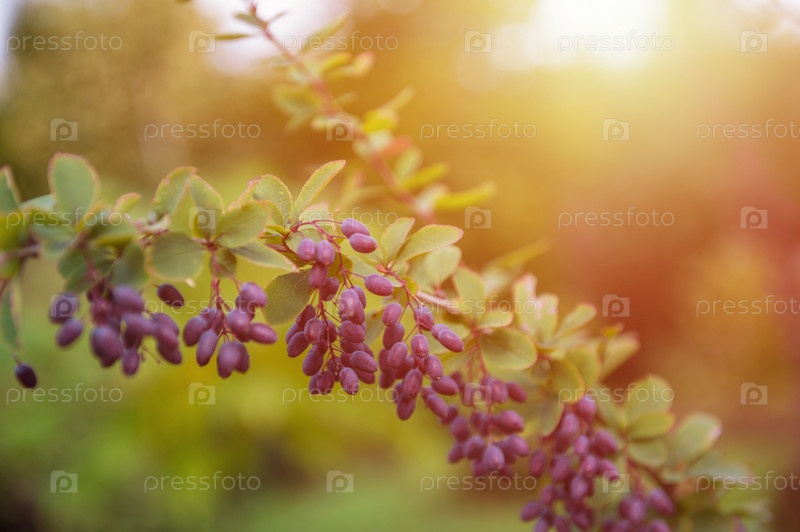 Ягоды барбариса. Спелый осенний барбарис на зеленом кусте