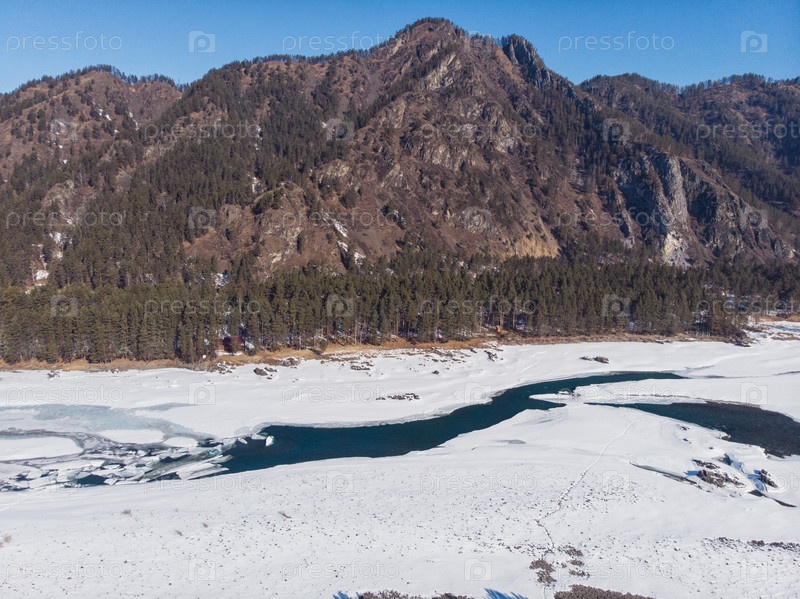 Вид с воздуха на зимнюю реку Катунь в горах Алтая