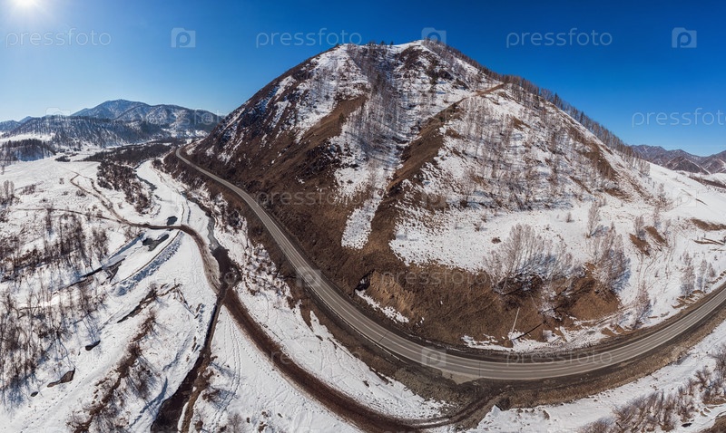 Вид с воздуха на дорогу в зимнем пейзаже Алтайских гор