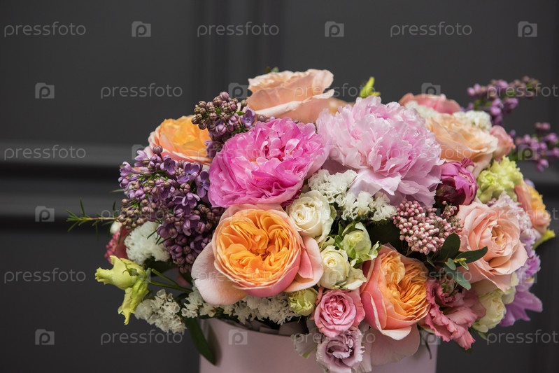 Букет из разных красивых цветов в круглой подарочной коробке на темном фоне
