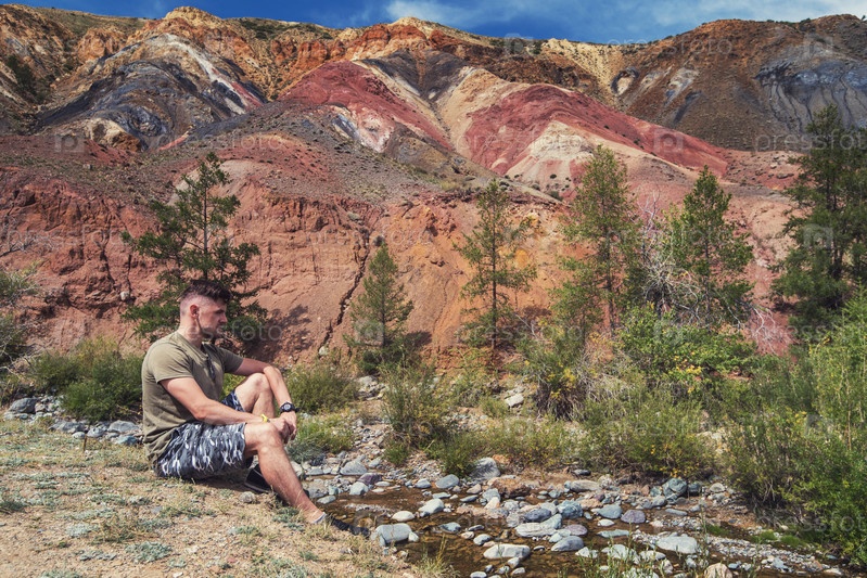 Отдыхающий мужчина в долине Марса, пейзажи Алтайских гор, Кызыл-Чин, Сибирь, Россия
