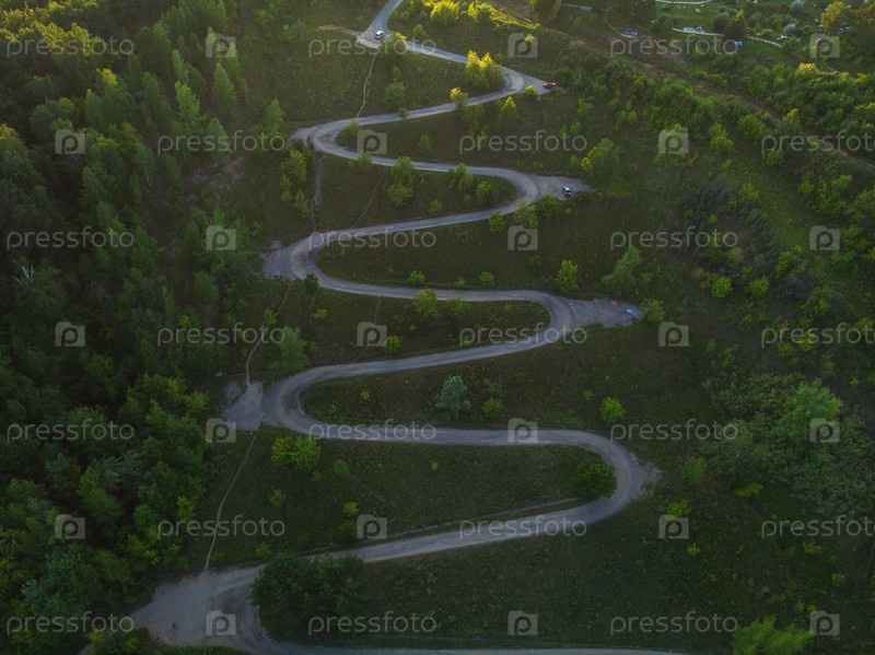 Вид сверху на извилистую дорогу в городе, снято с дрона